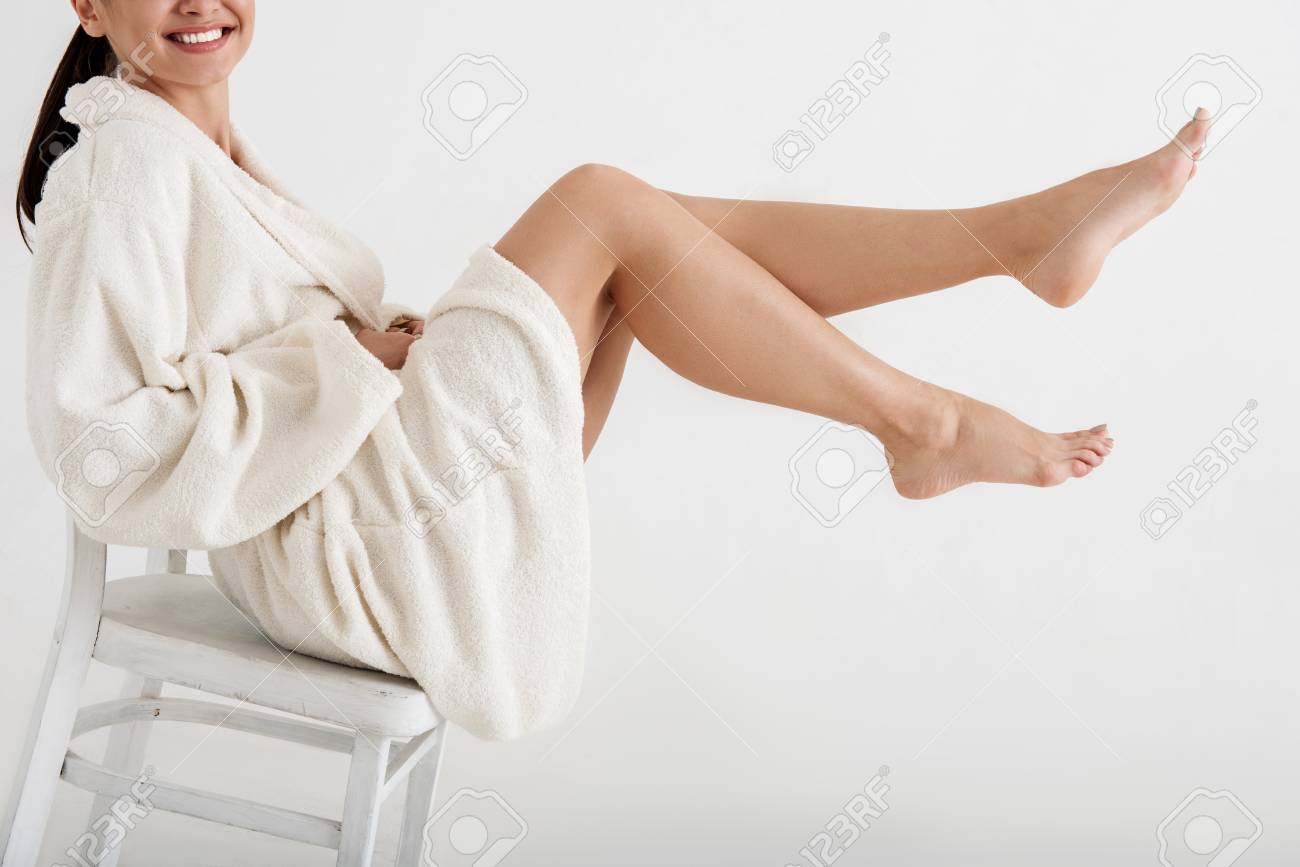 Happy Women Wearing Terry Robe Resting On Stool She Is Holding