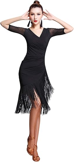 Women Black Sexy Latin Dance Dress Ladies Tassel Competition