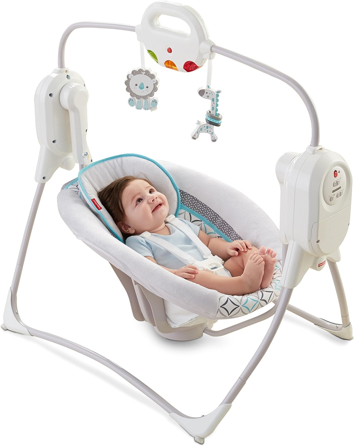 The fisher price twinkling lights spacesaver cradle n swing soothes and entertains your baby with gentle swinging melodies sounds and a light up overhead toy bar all in a smaller space saving design. Replaces battery door cover that comes with fisher price powerplus spacesaver cradle n swing for use with fisher price powerplus spacesaver cradle n swing item. Two different swinging motions help soothe and entertain baby along with a musical light show on the animal friends toy bar.
