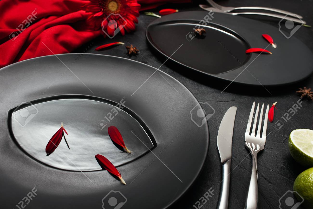 Matte Plate On Black Background With Red Accent Color Restaurant