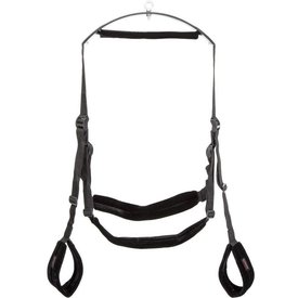 Fetish fantasy swing black. But this is no ordinary pleasure swing this swing features strategically placed d rings that connect to wrist and ankle cuffs. Comes with a primary and secondary strap and stirrups.