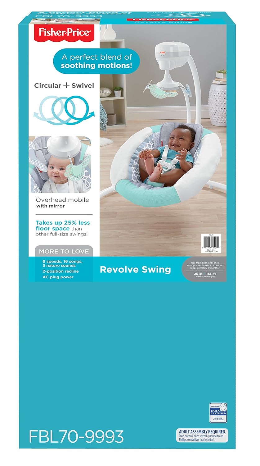The fisher price revolve swing is well designed with a very nice revolving and swivel motion. The fisher price revolve swing combines head to toe circular and swinging motions inspired by natural movements to help soothe your baby in a familiar way. As your baby reclines in the cozy seat with plush head suppor.