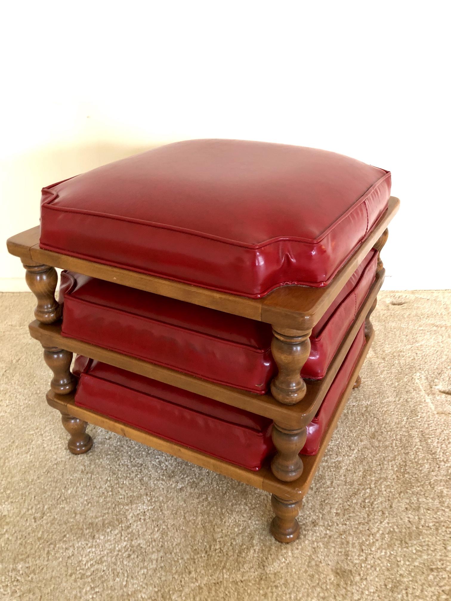 Vintage Ethan Allen Baumritter 3 Stacking Stools Wood Vinyl Red
