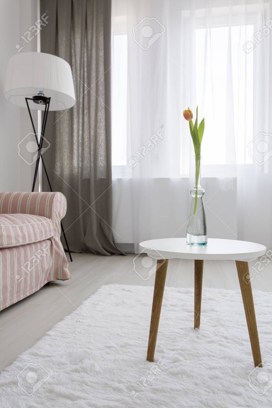 Light And Spacious Room With Small Table Floor Lamp And Sofa