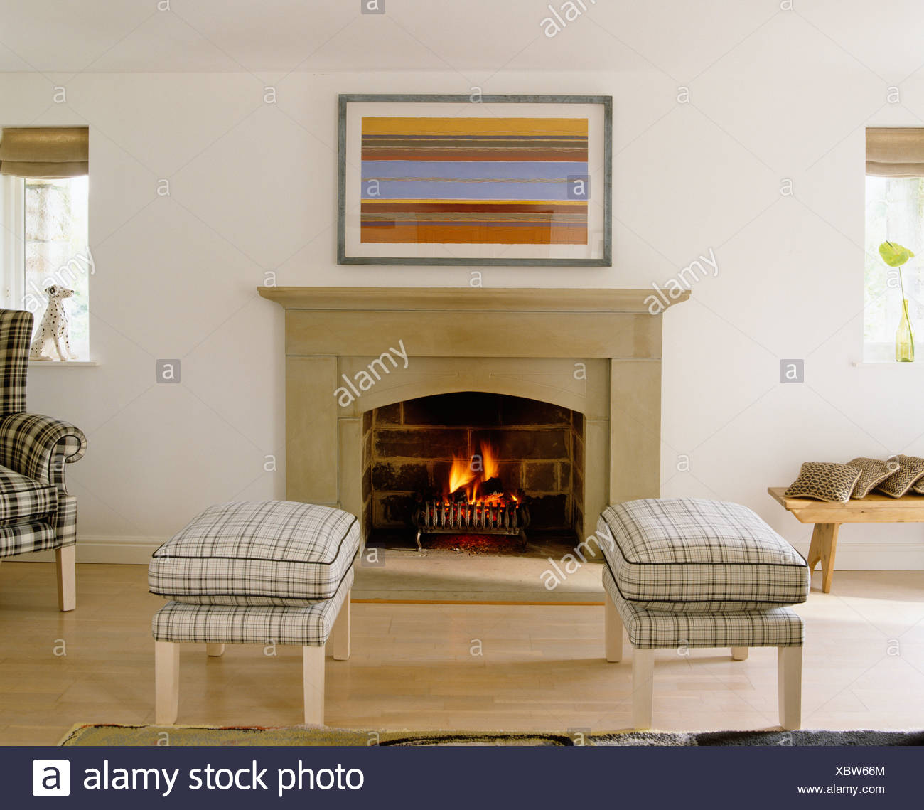 Pair Of Checked Upholstered Stools In Front Of Simple Fireplace