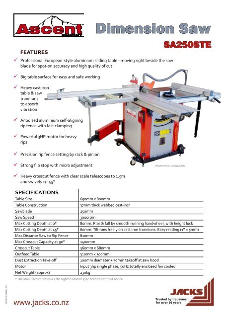Ascent Machinery Sa250ste Sliding Table Saw Jacks Co Nz