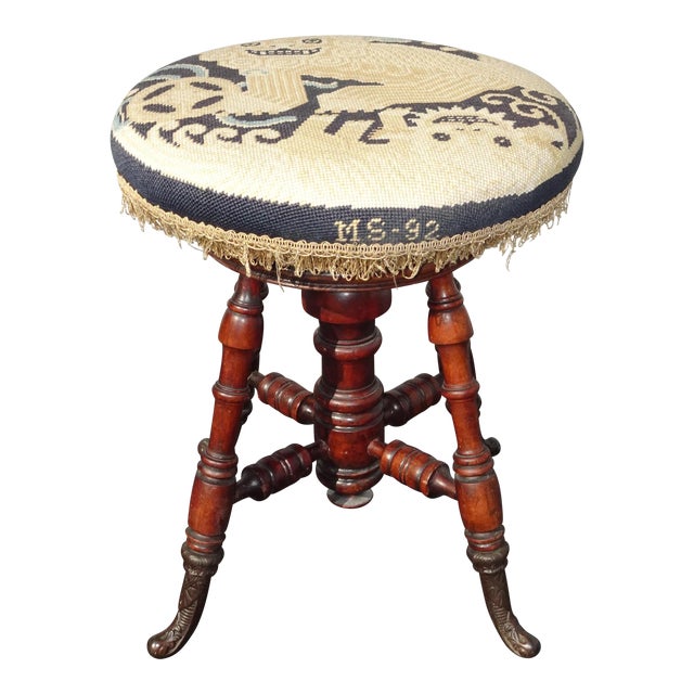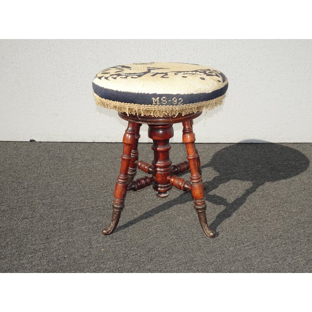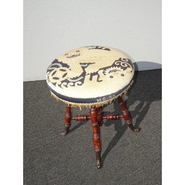 Vintage Mid Century Swivel Stool Bench Foo Dog Needlepoint Fabric