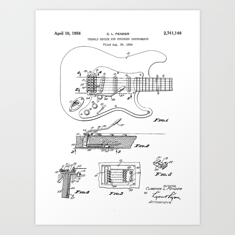 Guitar Tremelo Patent Guitarist Art Black And White Art Print