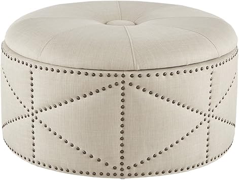 Beige Fabric All Over Button Tufted Round Ottoman Coffee Table